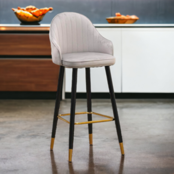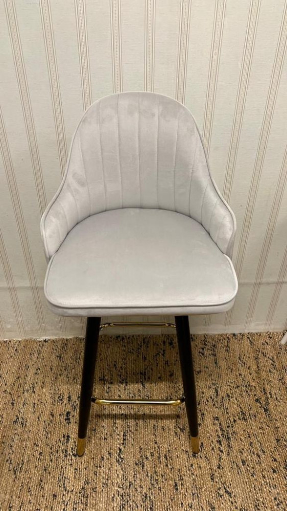 كرسي بار مخمل بارجل حديد مع استلس ومتاح بالون رمادي فاتح ومتوفر بمقاس 106سم وعمق 50 سم ويمكن استخدامه في المنازل والفنادق والمطاعم